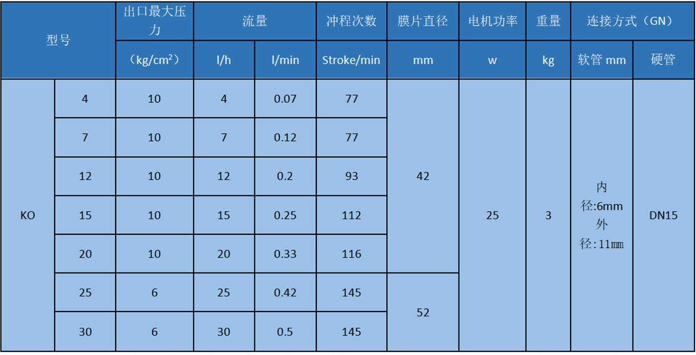 KO系列性能曲線表(清水測試值)