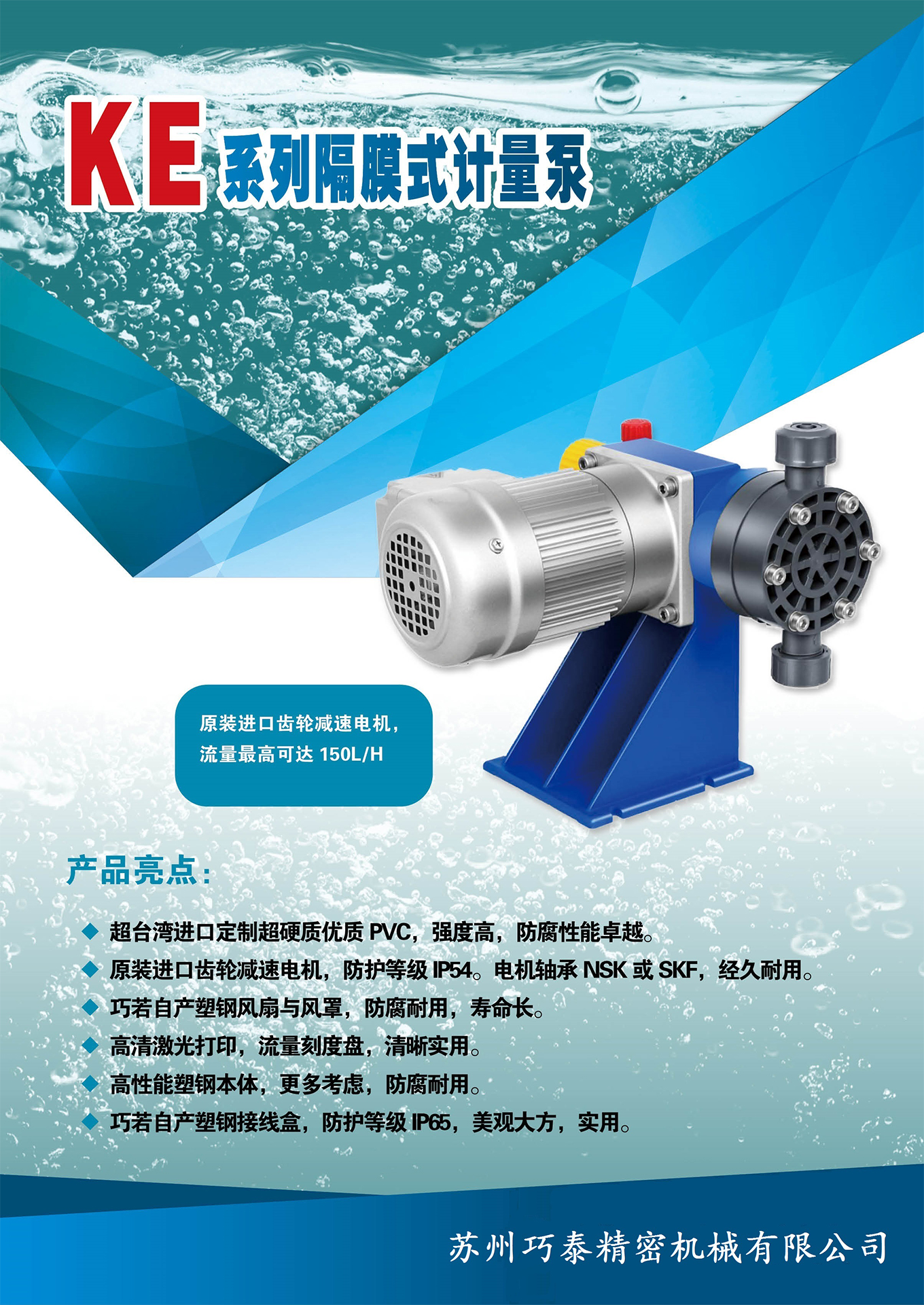 驅(qū)動方式:電機驅(qū)動,流量可達150L/H 工作條件:室內(nèi)/室外